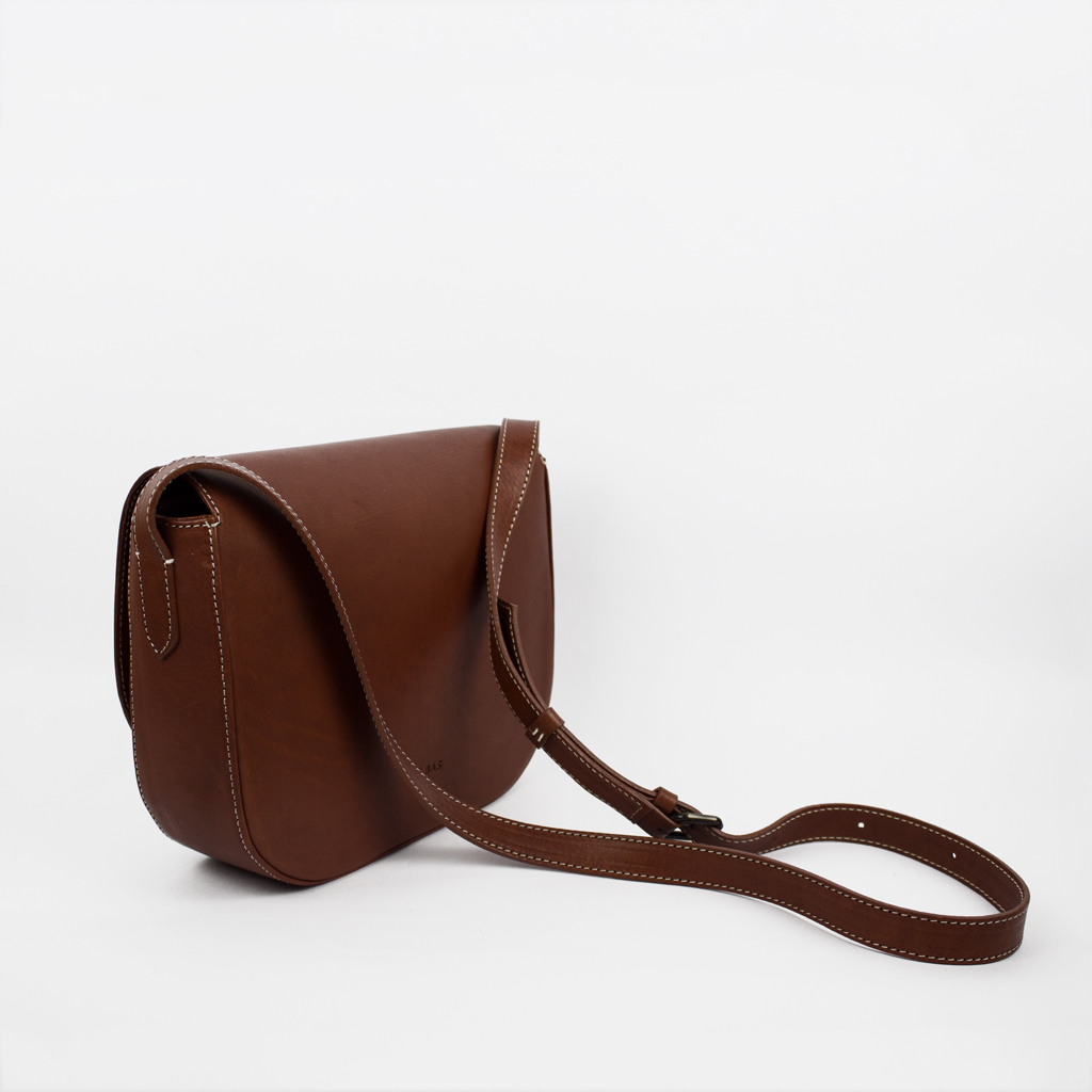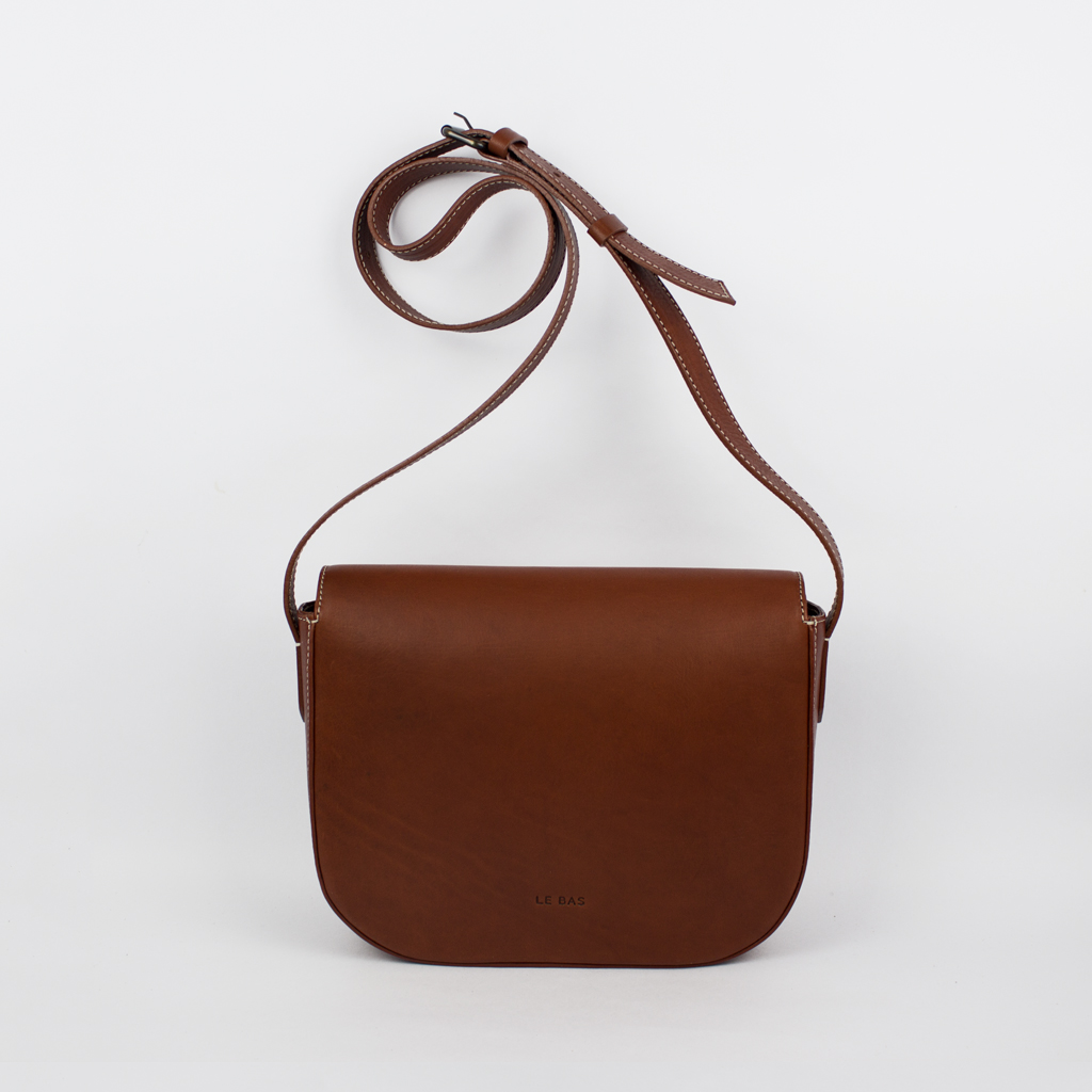 Bandolera redondeada rígida de cuero de curtido al vegetal con tapa y sistema de cierre magnético italiano. Interior forrado con gabardina de algodón crudo y dos divisiones. Bolsillo interior con cierre de bronce YKK. Correa regulable con hebilla de bronce. Se puede usar al hombro o cruzada.